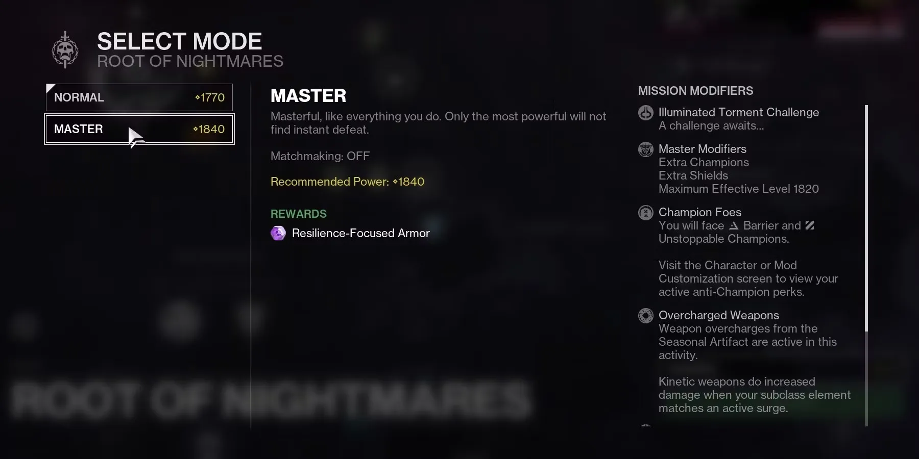 Теперь, когда Master Root of Nightmares доступен в Destiny 2, игроки могут начать его, перейдя к узлу Root of Nightmares на Нептуне во внутриигровом директоре. Там игроки увидят пункт "Мастер", расположенный под стандартным уровнем сложности "Нормальный".