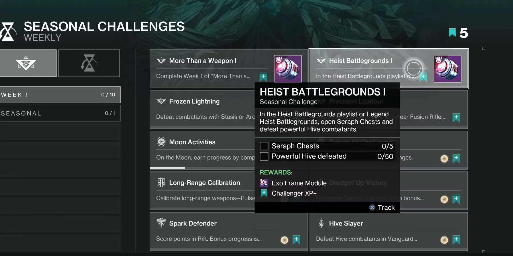 Модули Exo Frame приобретаются исключительно путем выполнения двух еженедельных сезонных заданий. Например, в первую неделю 19-го сезона игроки могут получить два модуля Exo Frame за выполнение квеста More Than a Weapon и сезонного задания Heist Battlegrounds I. Сезонное задание Heist Battlegrounds I требует от игроков открыть пять сундуков Seraph и убить 50 мощных ульев.