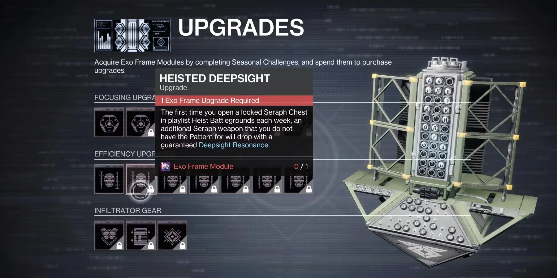 В каждом сезоне Destiny 2 есть предмет, который игроки могут получить, чтобы улучшить поставщика или предмет для этого сезона. Сезон Seraph не является исключением, и способ, с помощью которого игроки улучшают поставщика, - это приобретение модулей Exo Frame.