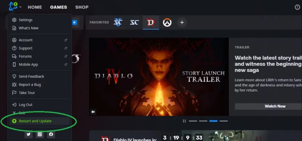 - Наведите курсор на логотип Battle.net в левом верхнем углу.