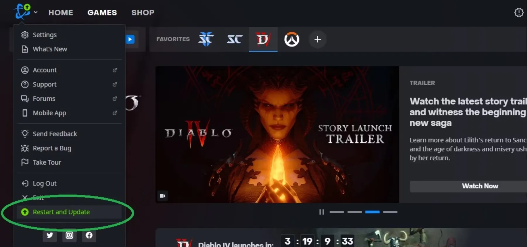 - Наведите курсор на логотип Battle.net в левом верхнем углу.