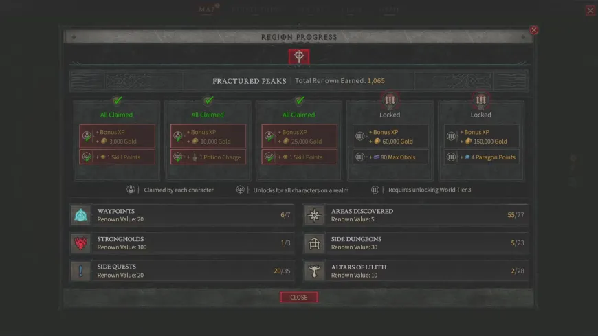 Diablo 4 отслеживает общее завершение игроками каждого региона на карте. По мере выполнения побочных заданий, подземелий и прочего игрок будет зарабатывать Renown для этого региона. При достижении определенного порога Renown игроки смогут получить награду. Бонусная награда XP за них значительна, но имейте в виду, что более высокие уровни требуют игры на более высоком мировом уровне.