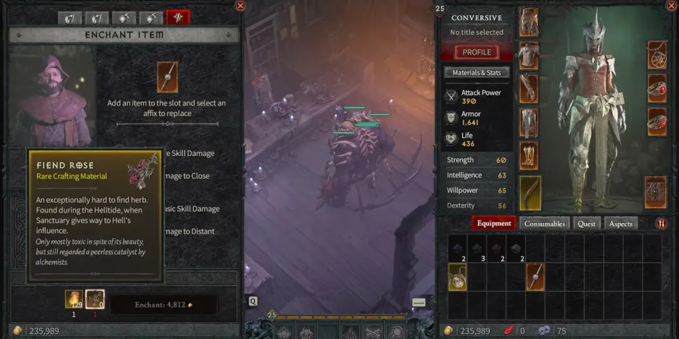В Diablo 4 игроки должны уметь изменять аффиксы на оружии, доспехах и другом снаряжении. Если на почти идеальном предмете есть бесполезный аффикс, игроки могут заменить его с помощью системы Enchant Item. Чтобы выбрать аффикс для замены, им понадобится сам предмет и одна роза Fiend Rose.