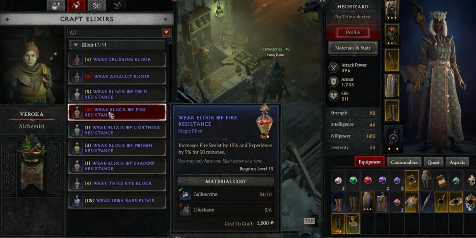 В Diablo можно добывать ресурсы, но пока в игру не добавлены профессии, поэтому игрокам приходится обращаться к NPC для выполнения ремесленных работ. В данном случае это Алхимик, который может либо переработать их в другой материал, либо сделать из них что-то другое. Эти услуги стоят золота, а также Gallowvine.
