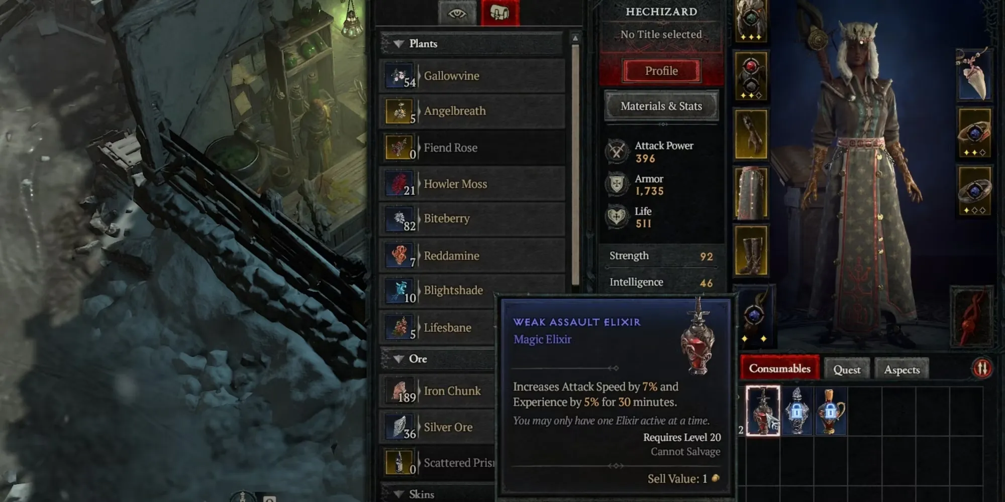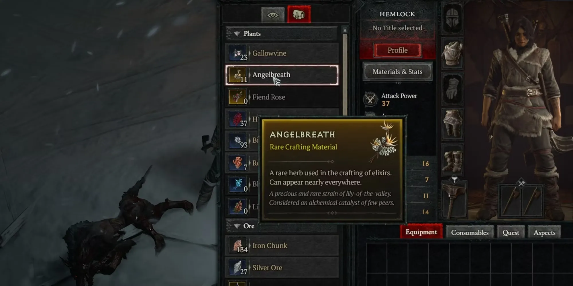 - Материалы. Вместо того чтобы загромождать пространство инвентаря или требовать использования другой сумки, здесь хранятся все сырьевые материалы, собранные в дикой среде. Сюда входят растения, шкуры, руды и драгоценные камни.
