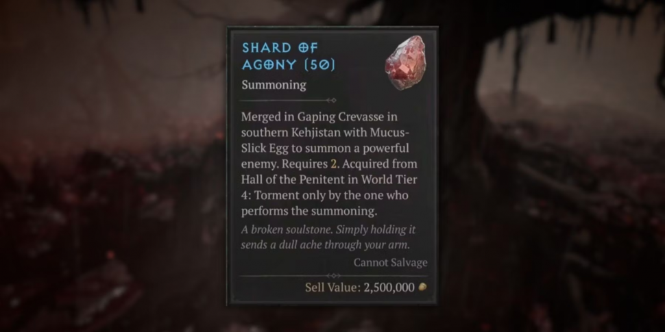 Этот материал можно использовать только для призыва Дуриэля. Но чтобы активировать алтарь этого босса, вам понадобятся как минимум два Осколка Агонии и два Яйца слизи. Отправляйтесь в подземелье Gaping Crevasse в самой южной части Кехджистана и найдите алтарь. Босс 100-го уровня покажется настоящим испытанием даже для самых опытных игроков, но зато вы сможете получить тонну ценных наград, включая уникальные Убер предметы.