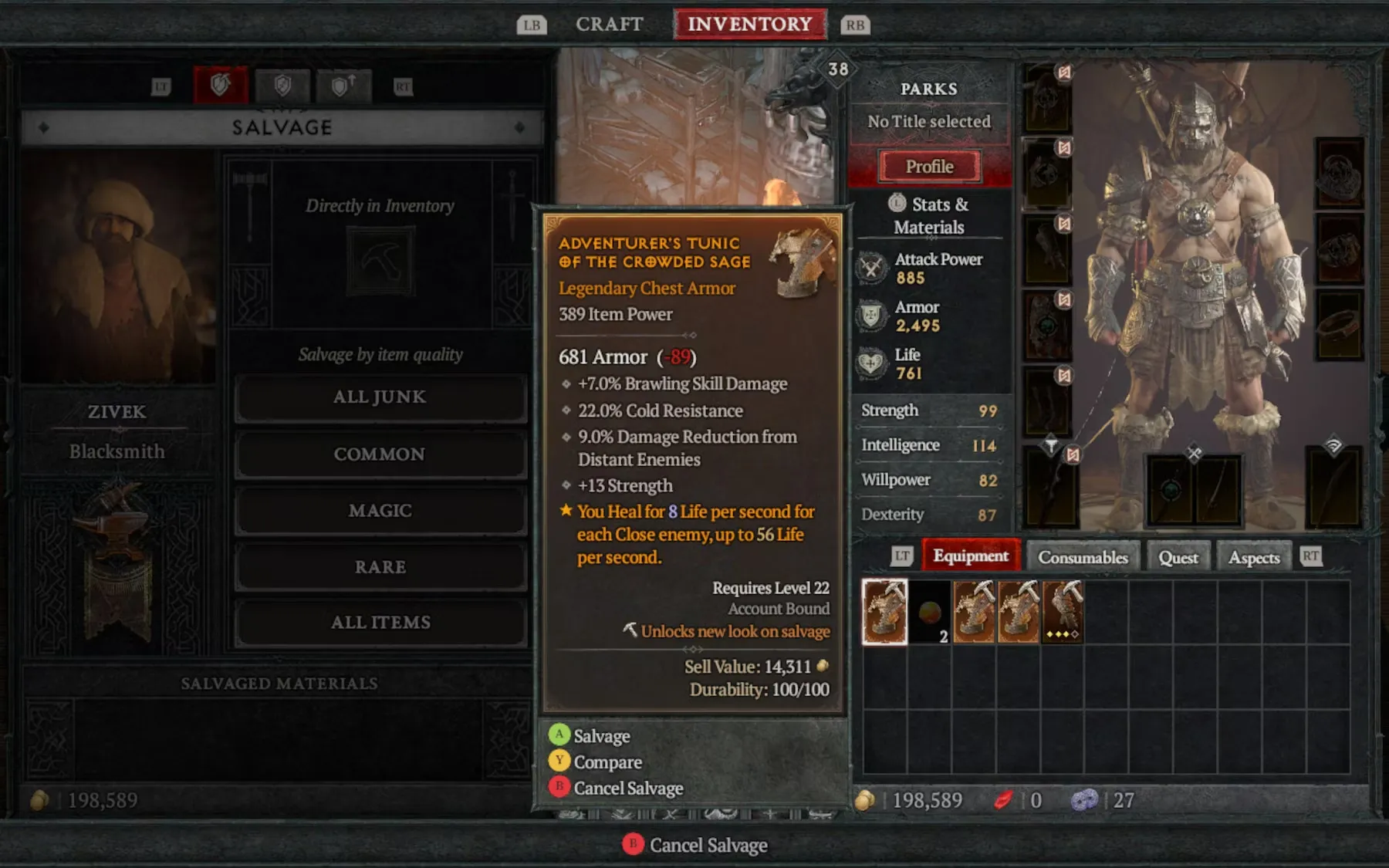 Хотя многим читателям уже ясно, как добывать Легендарные предметы в Diablo 4, несколько слов на эту тему могут оказаться полезными для некоторых. Все просто: игроки, которые хотят разобрать предмет, должны посетить кузницу, которую можно найти в большинстве городов и которая появляется на карте в виде значка наковальни, и выбрать вкладку Salvage. Здесь в верхней части меню появится надпись "Прямо в инвентаре", и игроки должны нажать на значок под этими словами, выбрать Легендарный предмет, который нужно разобрать, и подтвердить, чтобы выполнить действие.