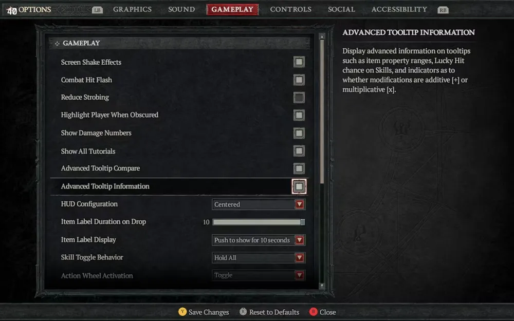 Эта настройка - Advanced Tooltip Information, и игроки могут найти ее на вкладке Gameplay в меню Options. Как говорится во внутриигровом описании, эта настройка добавляет "диапазоны свойств предметов" в подсказки, когда они активированы, и эти диапазоны позволяют игрокам увидеть, насколько хороши роллы предметов Diablo 4.