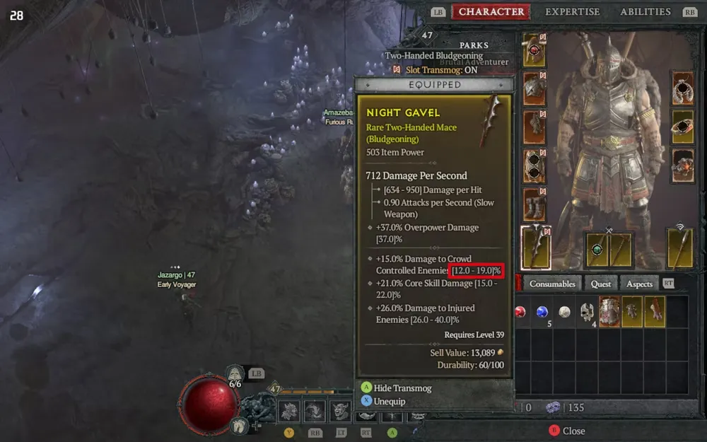 Чтобы конкретизировать эту идею на примере, игроки Diablo 4 могут представить себе оружие со статусом +15,0% урона по врагам, управляемым толпой. После включения функции Advanced Tooltip Information рядом со статистикой появится диапазон значений в скобках, который указывает минимальное и максимальное значения, с которыми оружие могло бы прокачаться. В данном примере этот диапазон значений составляет 12,0-19,0%, что подтверждает, что это конкретное оружие имеет средний показатель урона по врагам, контролируемым толпой.