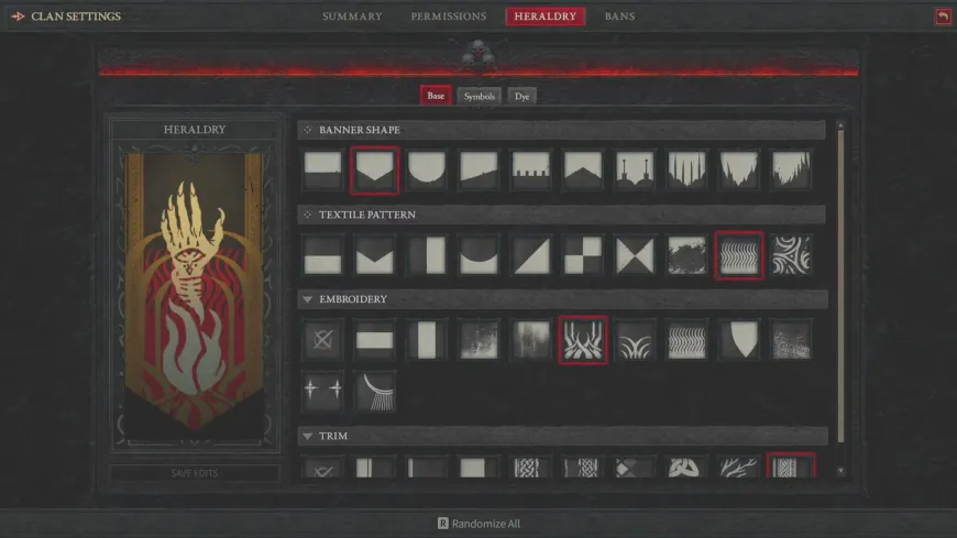 - На вкладке "Геральдика" лидер клана может настроить знамя. Фон, символы и цвета можно настроить с помощью меню. Игроки, которым сложно проявить творческий подход, могут воспользоваться кнопкой Randomize All, чтобы получить несколько идей.