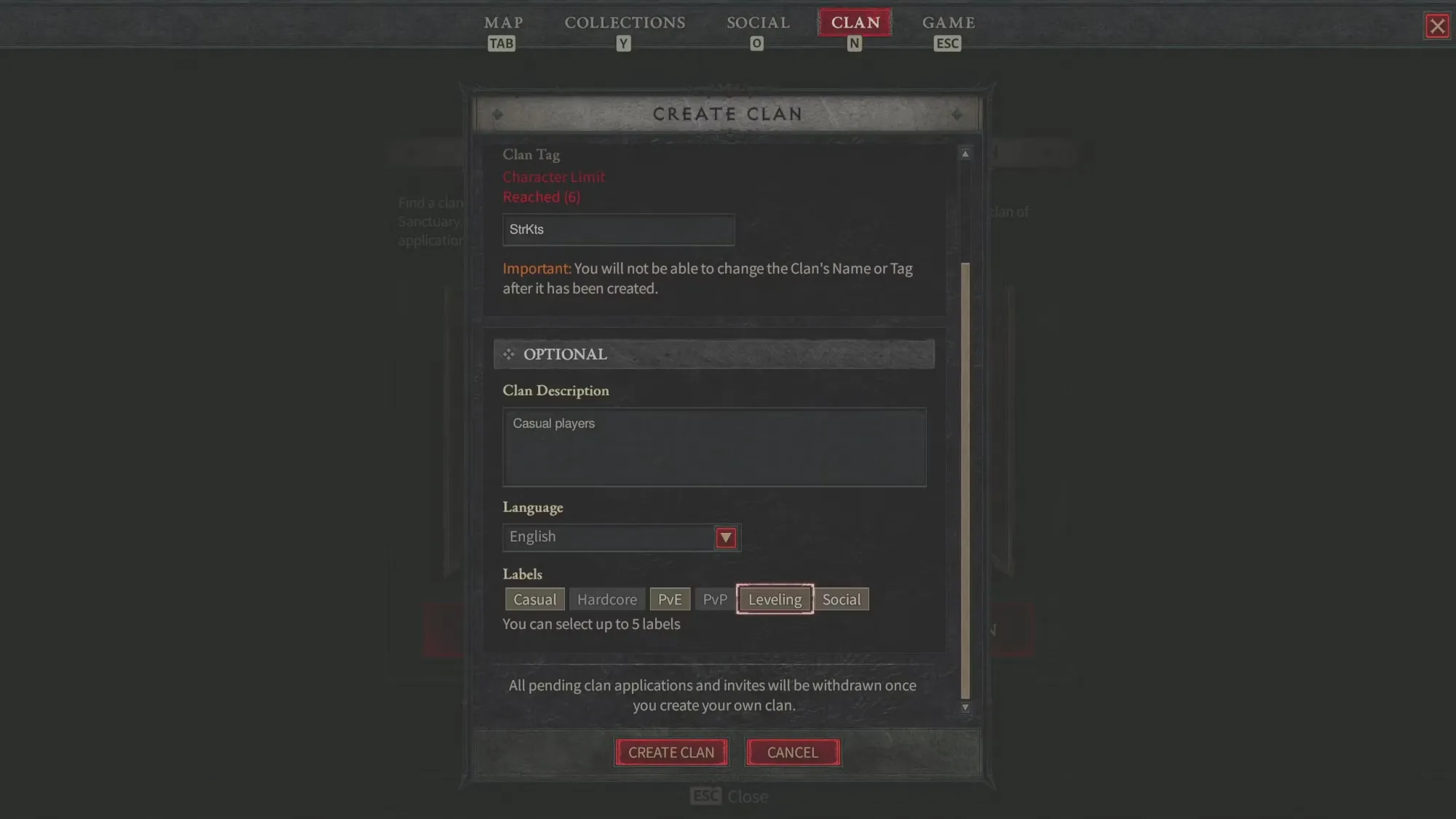 - Описание клана, язык и метка необязательны, но если это будет публичный клан, игрокам стоит заполнить это поле. Это хорошее место, чтобы упомянуть о том, будут ли люди в этом клане пропускать сюжет или на какой сложности они предпочитают играть.