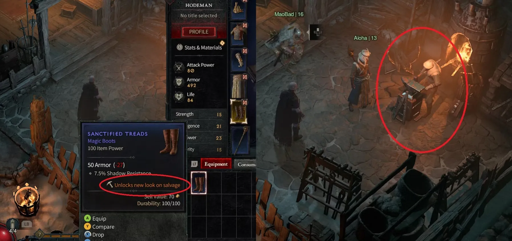 Отправляйтесь к кузнецу и поищите значок, указывающий на то, что эта вещь может дать новый вариант трансмога. Попросите кузнеца переделать предмет для нового облика и получите несколько нужных предметов.