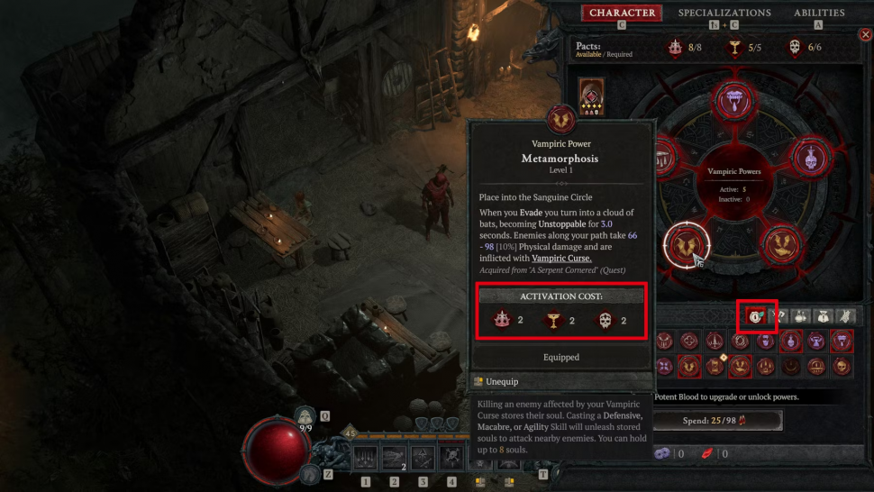 После этого игрокам следует обратить внимание на вампирические способности Diablo 4, которые можно найти на вкладке Seasonal в инвентаре персонажа. Изучая сезонные способности, игроки получат информацию об их действии, способах разблокировки и стоимости активации. Именно последний из этих пунктов имеет отношение к данному руководству, и действительно, под стоимостью активации каждой вампирической силы фанаты увидят три вышеупомянутых символа Пакта.