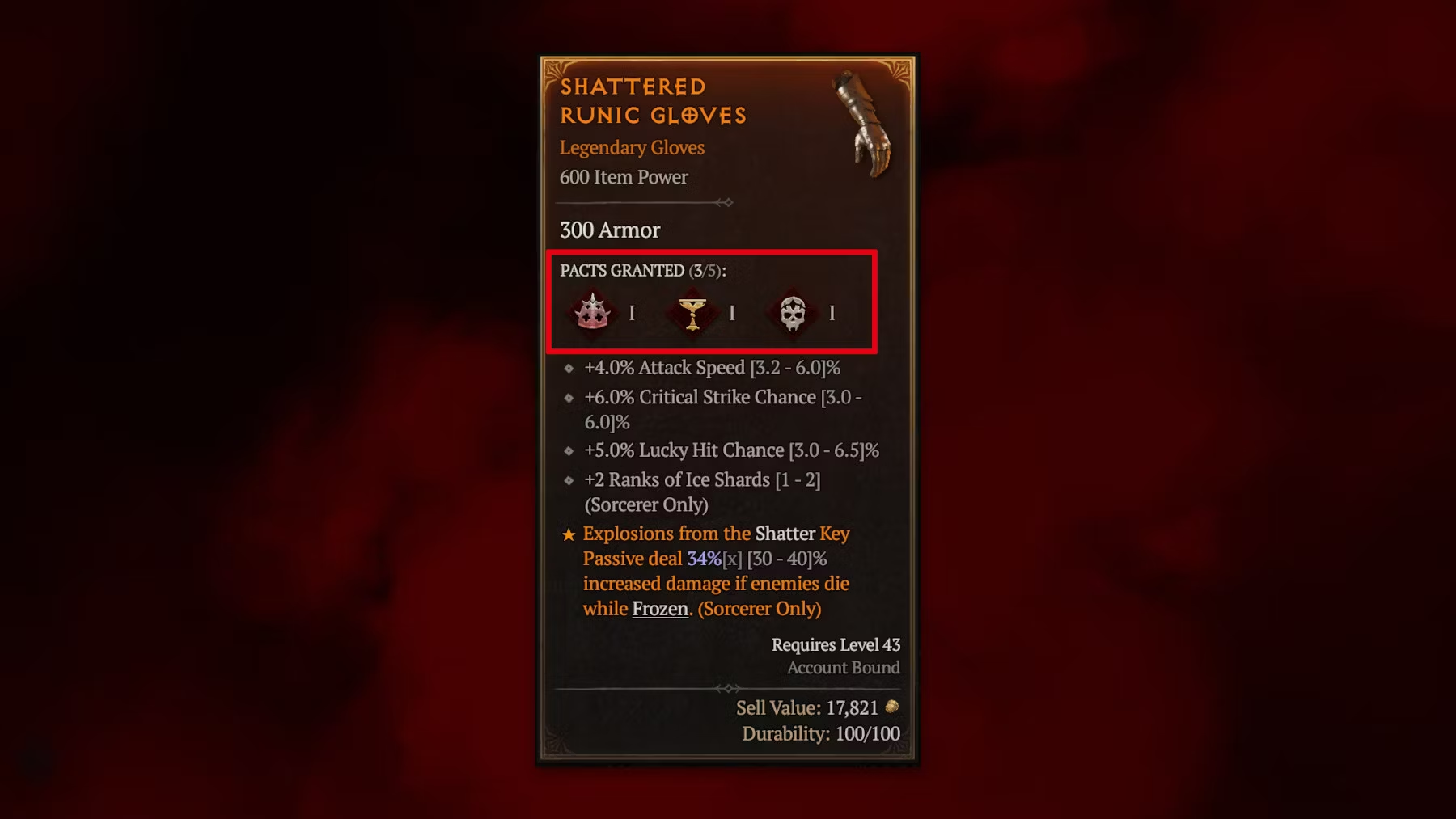 И последнее, о чем следует упомянуть, - это то, что доспехи в Diablo 4 имеют максимальное количество Пактов, которые они могут обеспечить. Это указано справа от надписи "Pacts Granted" на предмете Pact Armor, и игроки обнаружат, что большинство предметов способны дать больше Пактов, чем они имеют при первоначальном получении. Это дает возможность использовать вышеупомянутые предметы, дающие пакт, для улучшения доспехов, хотя эти предметы больше нельзя использовать, когда доспехи достигают максимального количества пактов.