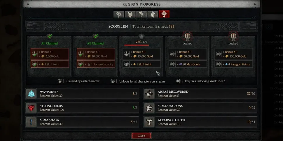 Прежде всего, необходимо отметить, что если все исследования карты, проведенные в Вечном царстве, могут быть перенесены в Сезонное царство, то с Renown дело обстоит иначе. Действительно, на сезонные персонажи переносится только то Renown, которое было заработано при взаимодействии с Алтарями Лилит в Diablo 4 и при открытии новых территорий, и этого должно быть достаточно, чтобы сразу же получить два уровня наград Renown в каждом из пяти регионов карты.