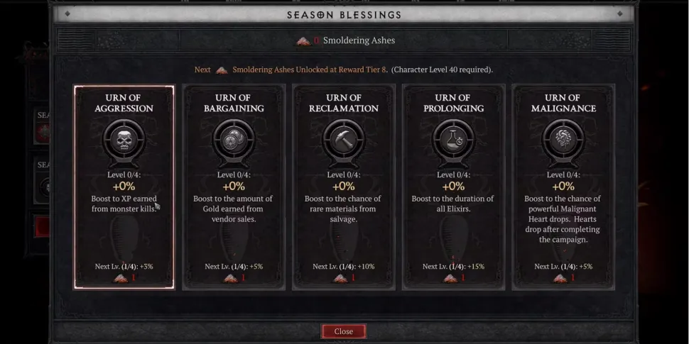 Тлеющий пепел зарабатывается в определенных точках бесплатного Боевого пропуска, и его можно использовать для улучшения Сезонных бонусов. Эти сезонные бонусы активны для всех сезонных персонажей и включают постоянные бонусы к получению XP, золота, материалов, продолжительности действия эликсира и шансу выпадения злокачественного сердца. Система ограничена уровнем, фактически, первый Пепел можно потратить только на 40-м уровне, так что это не то, что игроки могут сделать с самого начала.