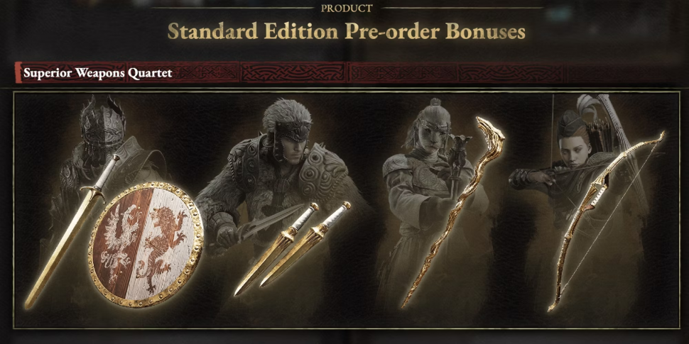 В Dragon's Dogma 2 есть два разных уровня бонусов за предзаказ, которые зависят от того, какое издание приобрел игрок. Как в стандартном, так и в делюкс-издании будет доступен бонус предварительного заказа Superior Weapon Quartet. Кроме того, в Deluxe Edition Dragon's Dogma 2 будет доступен бонус предзаказа Ring of Assurance.