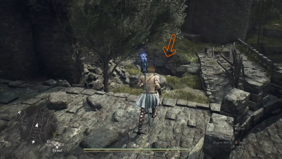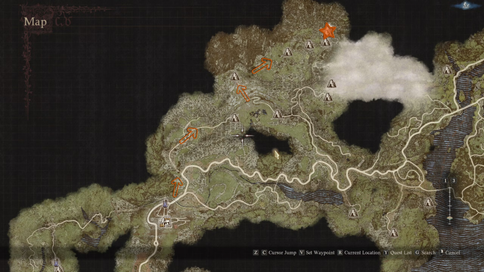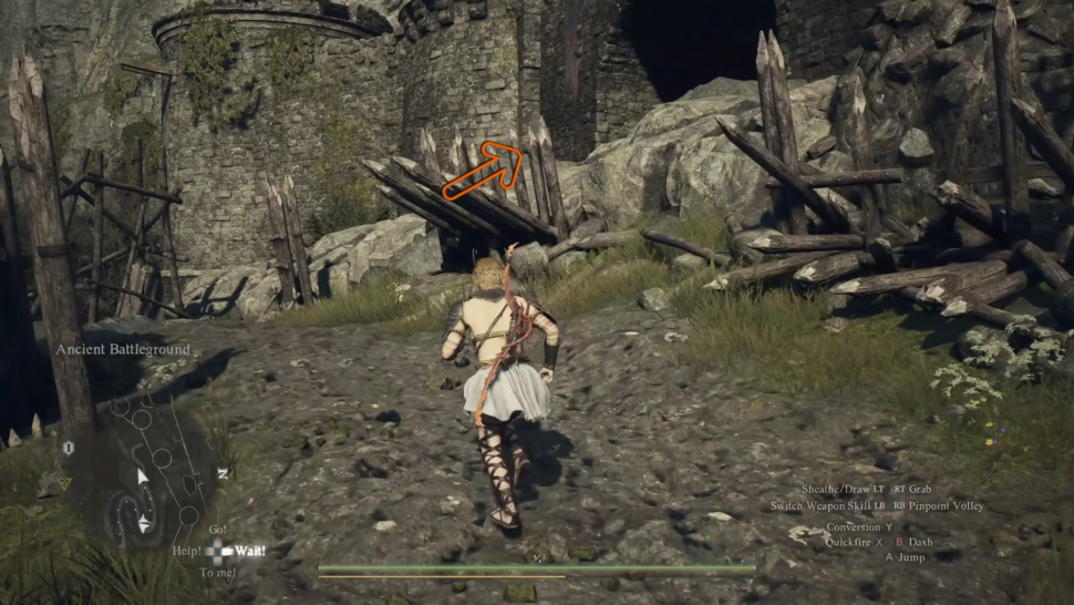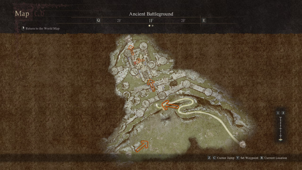 Выйдя из города, отправляйтесь сначала на север и продолжайте идти по тропе, пока не дойдете до скал, с которых можно спуститься. Продолжайте двигаться на север, а затем на восток, пока не придете к западному входу в Древнее поле битвы.