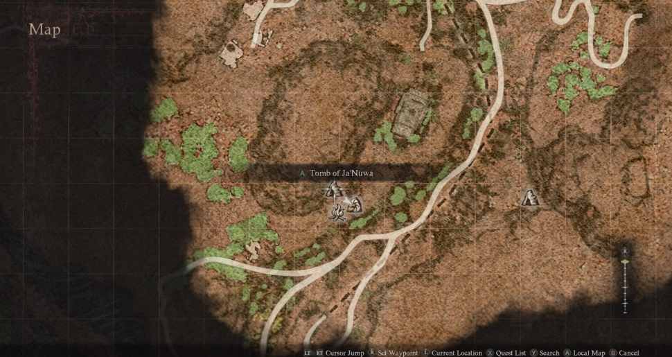 Гробница Джа'Нува находится в Баттале, ее можно найти к юго-западу от Бакбаттала, чуть южнее здания, отмеченного на карте, и слева от пещеры Каньон. Сразу за Гробницей Джа'Нува находится Рифтовый камень Клыкастого и костер.
