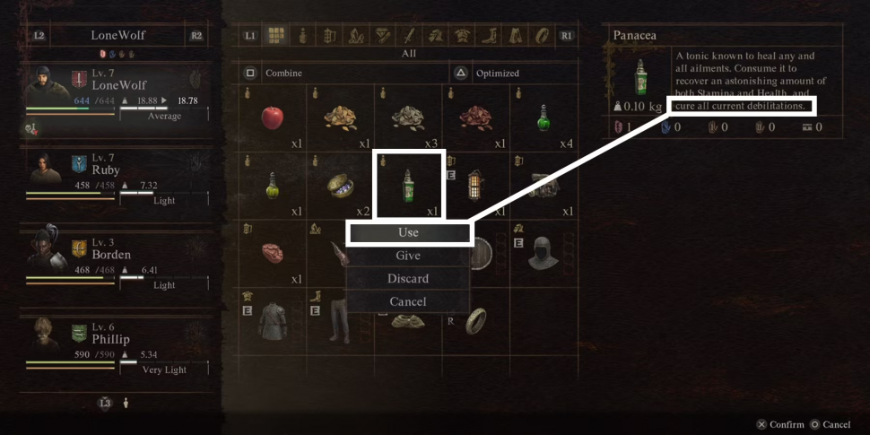 Заболевание возникает не только от атак врагов, но и от других источников, например от употребления гнилой пищи. Вы можете защитить свою еду, храня ее в трактирах или в сундуке для хранения у Arisen в их доме в Dragon's Dogma 2. Вы даже можете комбинировать и делать новые лечебные средства в меню трактира, где вам доступны все ингредиенты, которые вы хранили раньше.