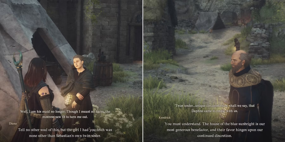 Игроки встретят Дафну в Трущобах во время выполнения квеста The Gift of Giving в Dragon's Dogma 2. Она - вылитый Себастьян, что вызывает подозрения в ее истинной сущности. Чтобы доказать эти подозрения, мать Себастьяна впадает в панику, увидев хрупкую девушку в своем поместье, и увольняет горничную сразу после завершения квеста.