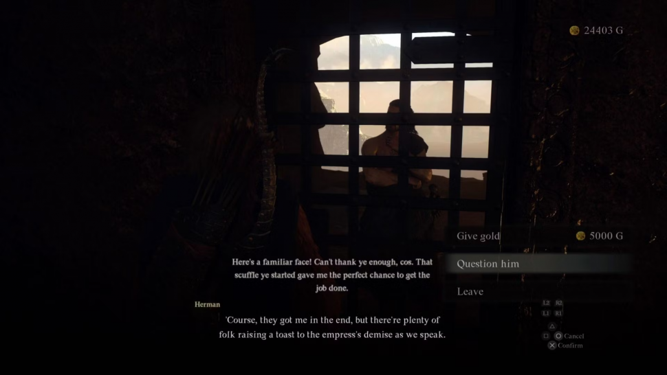 Как только вы попадете в тюрьму, поверните налево по коридору и поговорите с NPC в первой камере справа по имени Герман. Чтобы получить от него информацию о том, кто подговорил его на это задание, у вас есть возможность либо допросить его, либо подкупить золотом за ответы. Если вы решите допросить его, он уволит вас, но если вы дадите ему 5 000 G, он скажет вам, что работал на Коралловых Змей и что вам следует поговорить с членом гильдии, который также находится в тюрьме.
