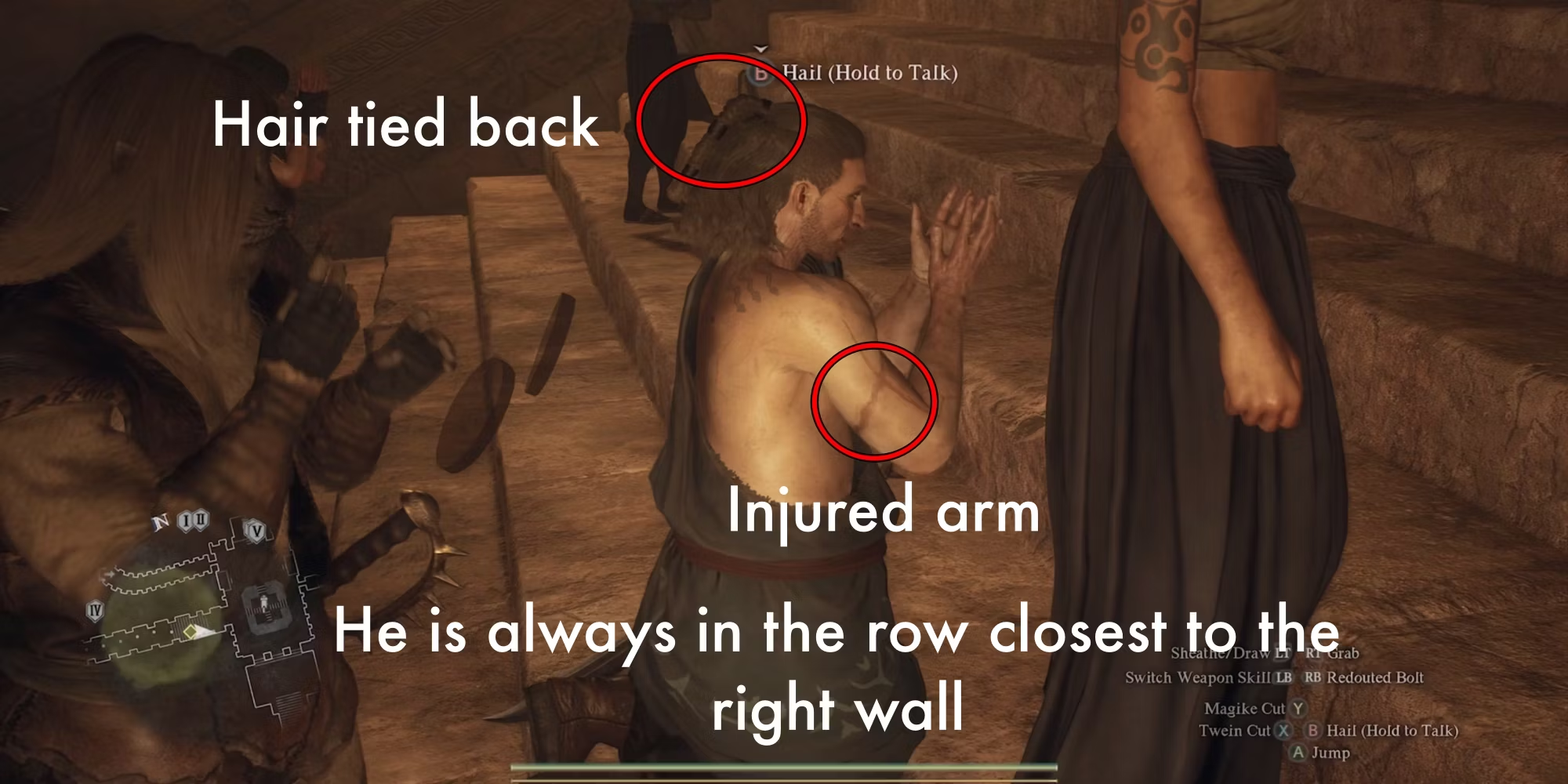- Нападающий одет в зеленую тогу и стоит на коленях. Если игрок включит фонарь, то через его правую руку будет видна небольшая красная линия. Он находится в ряду, ближайшем к правой стене ступеней, и старается слиться с толпой. Приближаясь к нему, будьте очень осторожны, чтобы не схватить не того человека. Нажмите R2/RT, чтобы схватить. Как только нужный человек будет задержан, начнется сцена, которая приведет к завершению миссии.