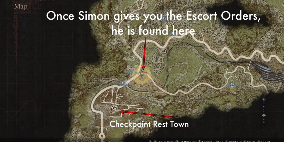 Следующим шагом будет отправиться в Городок отдыха на западе Вермунда и приступить к выполнению задания. Смотрите карту выше, чтобы найти точное место, где Саймон и повозка будут ждать Августина, человека, которого должен сопровождать Арайзен.