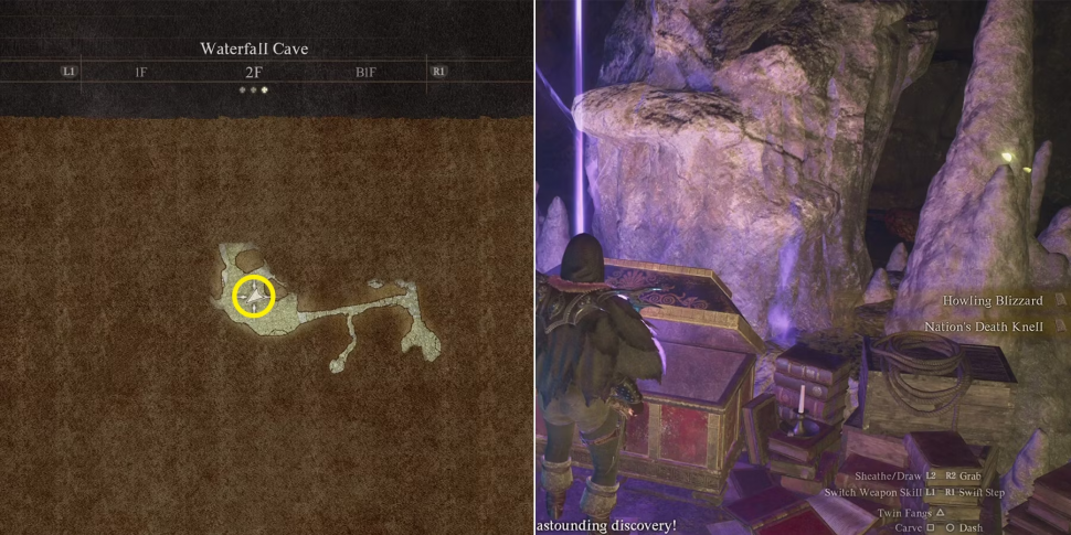 В пещере Водопада игроки получат гримуар "Howling Blizzard", а также гримуар "Nation's Death Knell". При открытии сундука с сокровищами появится рыцарь. Победите его, чтобы получить 150 RC, выдающийся плащ и черный кристалл в Dragon's Dogma 2.