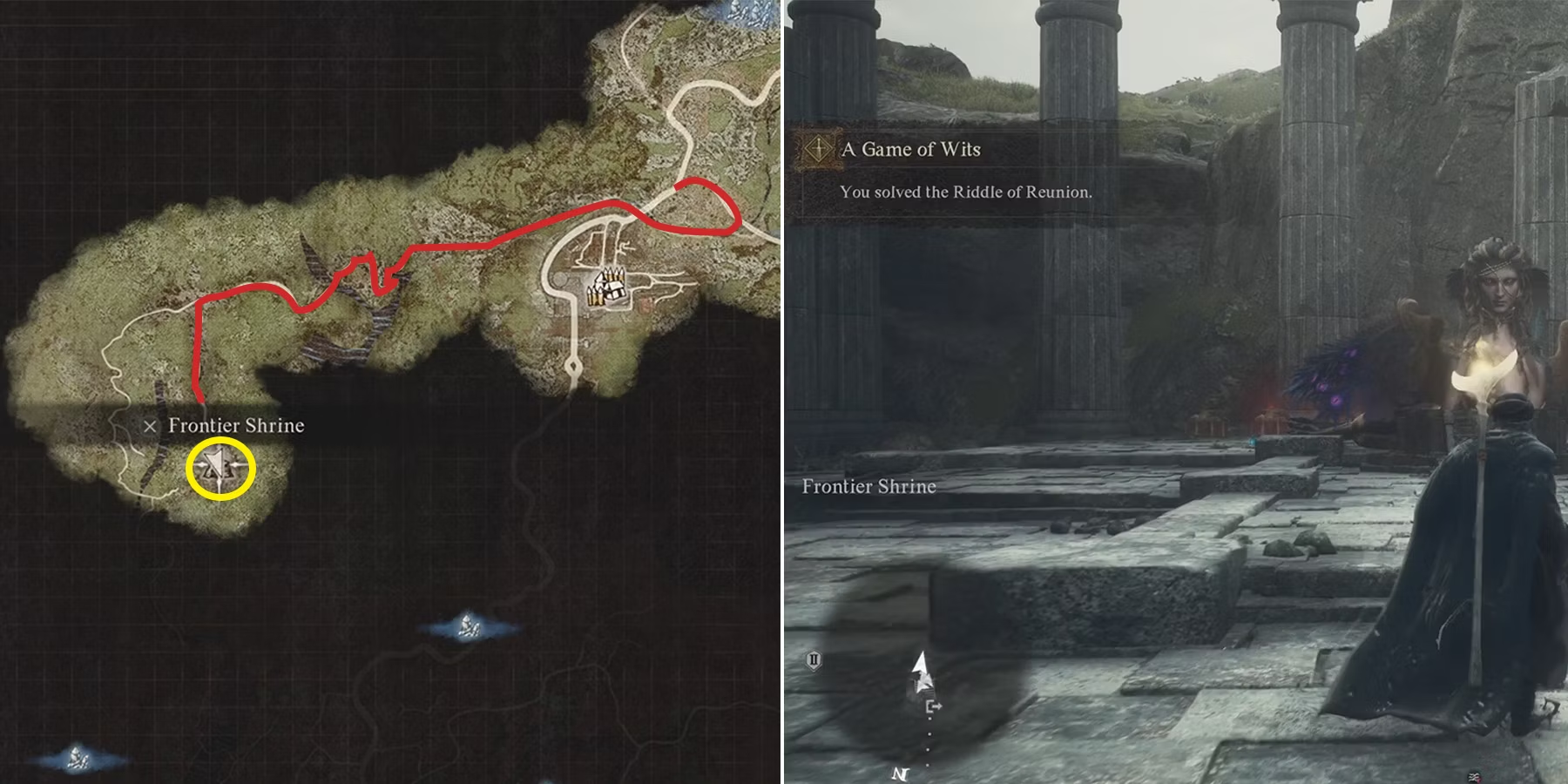 Чтобы разгадать Загадку воссоединения, отправляйтесь в Пограничное святилище, которое находится к юго-западу от Города отдыха на контрольной точке. Дорога, ведущая к святилищу, полна крупных врагов, поэтому игрокам следует отправляться в это путешествие с хорошо укомплектованной командой в Dragon's Dogma 2. Прибыв в Пограничное святилище, вы автоматически решите Загадку воссоединения и откроете первый сундук с сокровищами, в котором находится 100 000 золотых в Dragon's Dogma 2.