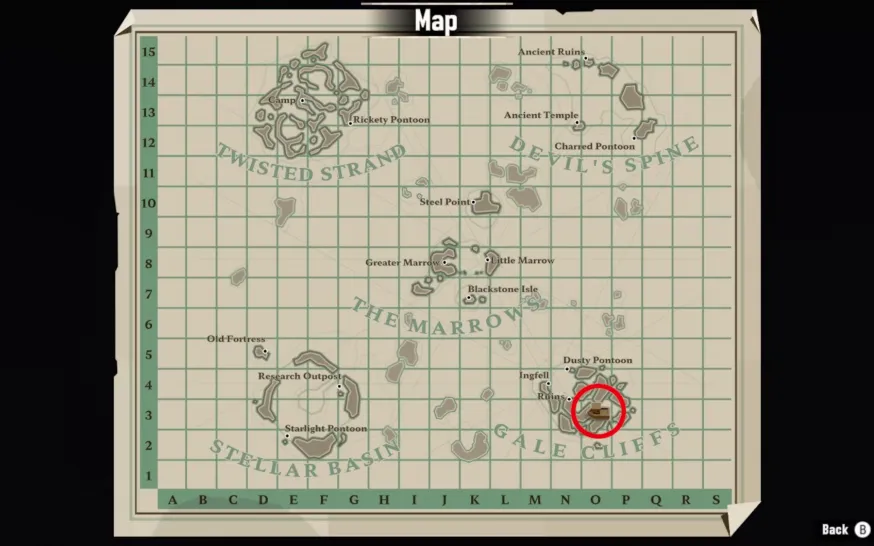 После того как все будет подготовлено, игроки, которые осмотрят периметр Gale Cliffs, найдут несколько мест для рыбалки, населенных морскими угрями. Одно из таких мест находится в северо-западном углу P4, и оно отмечено на карте, приведенной ниже. Игроки также могут ловить угрей в ночное время во внутренних частях Gale Cliffs, в том числе в центре 03, хоть там и более опасные воды.
