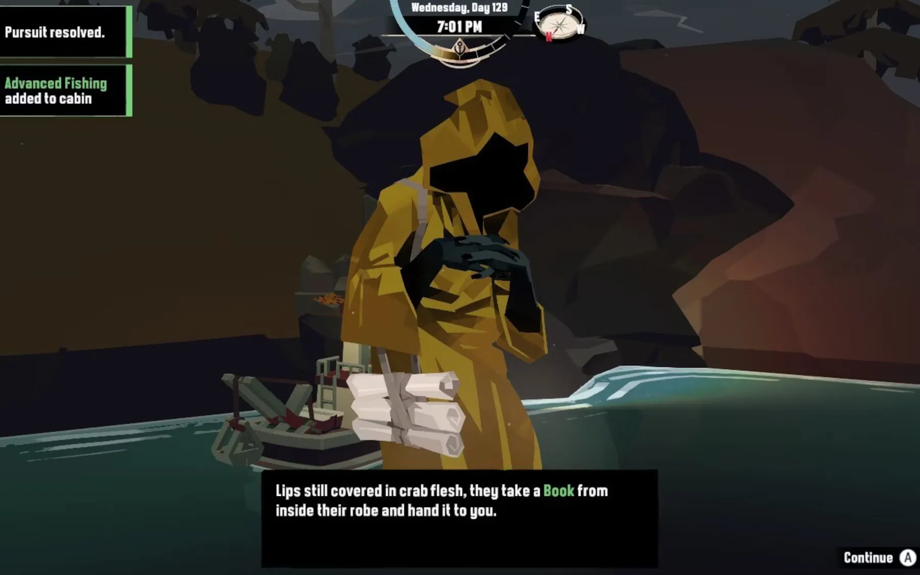 Отдав синего краба фигуре в капюшоне, игроки завершат игру "Фигура в золоте" и получат свою награду. В частности, поклонники видеоигр о рыбалке получат книгу Advanced Fishing, которая при прочтении увеличивает эффективность удочки на 15%.