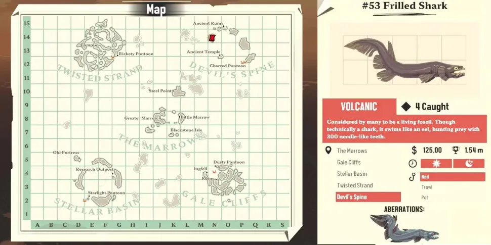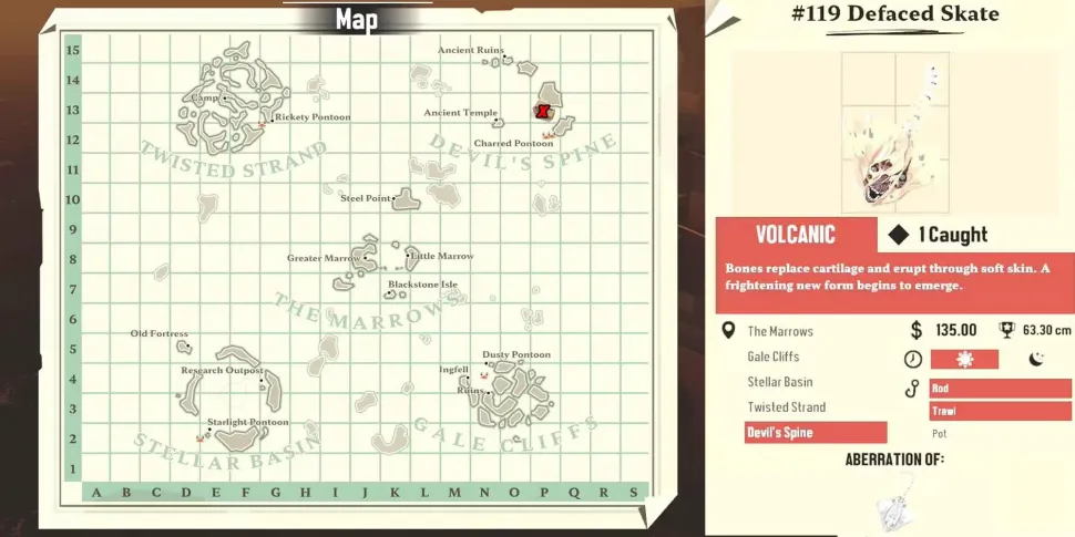 Это отклонение Pale Skate можно найти в Devil's Spine, и для его добычи потребуется вулканическое рыболовное снаряжение. При относительно низкой стоимости емкости в 5 мест это существо стоит того, чтобы его поймать. Однако для его поимки придется пройти через некоторые из самых опасных участков карты, поэтому будьте особенно осторожны, охотясь за этим существом.
