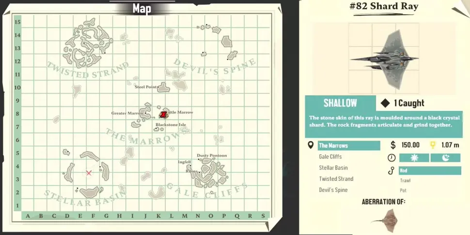 Эту абберацию Stringray можно найти на мелководье в окрестностях The Marrows. Занимая 7 мест в инвентаре, он представляет собой относительно крупный улов для рыбы в этой области, но его простая форма означает, что он не будет слишком неудобным для расположения и организации. Для этой области игры существует не так много рыб, которые могут обеспечить такой уровень прибыли, поэтому он стоит того места, которое занимает.