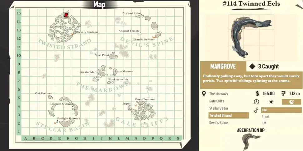 Мангровые воды вокруг Twisted Strand являются домом для некоторых из самых странных существ и самых захватывающих тайн в мире Dredge. Как и в настоящих болотах, здесь в изобилии водятся угри и сомы, и исследователи могут ожидать, что в какой-то момент им встретится Twinned Eels, своего рода мутантная версия Longfin Eel. Этот экземпляр будет стоить необычайно дорого, особенно учитывая его компактные размеры и минимальную нагрузку на складские запасы.