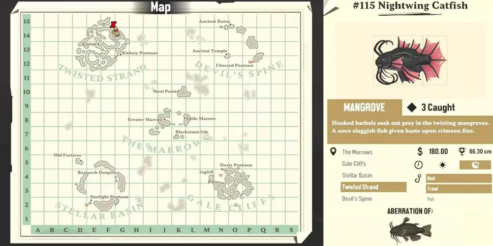 Еще один вид, обитающий в мангровых зарослях, с которым игроки могут столкнуться, - сом. Мутировавшая Абберация превращается в Nightwing Catfish, инопланетноподобное существо с крючковатыми колючками, торчащими из морды. В среднем за такую добычу придется заплатить 180 долларов.