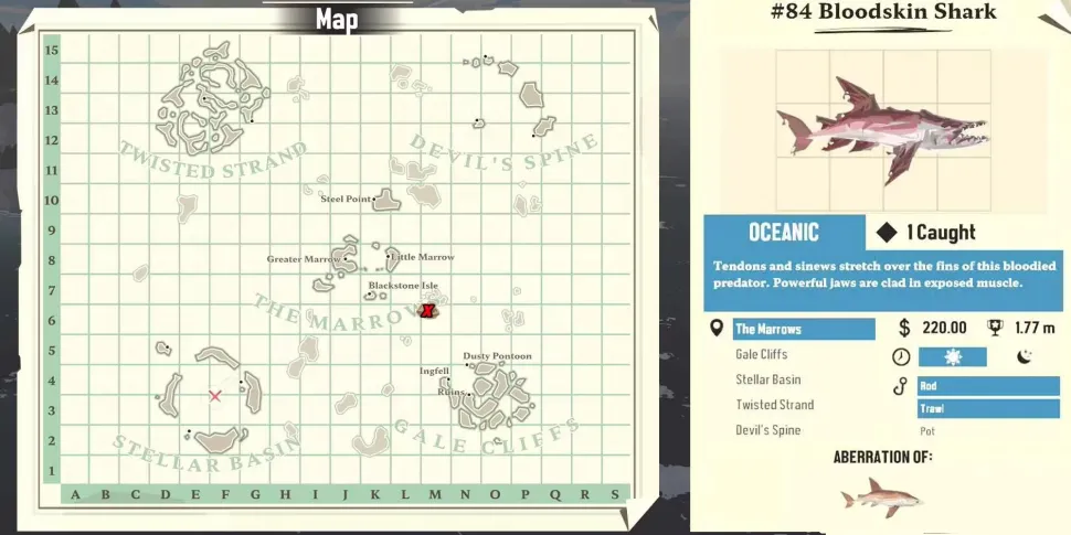 Bloodskin Shark - это аберрация бронзового китобоя. Ее можно найти, ловя рыбу в океаническом регионе вокруг Марроуза, в частности на острове Блэкстоун. Эти мутанты могут стоить более чем в два раза дороже обычного бронзового китобоя, поэтому, если их поймать, они принесут значительную прибыль.