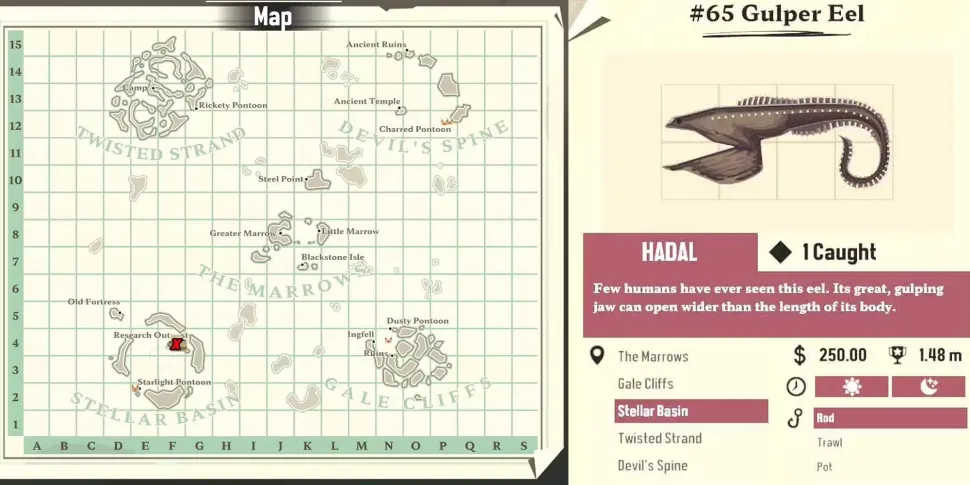 The Gulper Eel - один из самых редких и прибыльных видов угрей, которых можно поймать в Dredge. Обычно обитающие во внутреннем круге Звездного бассейна, эти сверхъестественно выглядящие рыбы имеют гигантскую, похожую на змеиную, выдвижную челюсть и способны поглощать добычу крупнее себя. Как редкий вид, The Gulper Eel будет стоить дорого. Этот вид также будет востребован Странствующим торговцем в рамках задания "Запись редкостей", поэтому за ним стоит побороться.
