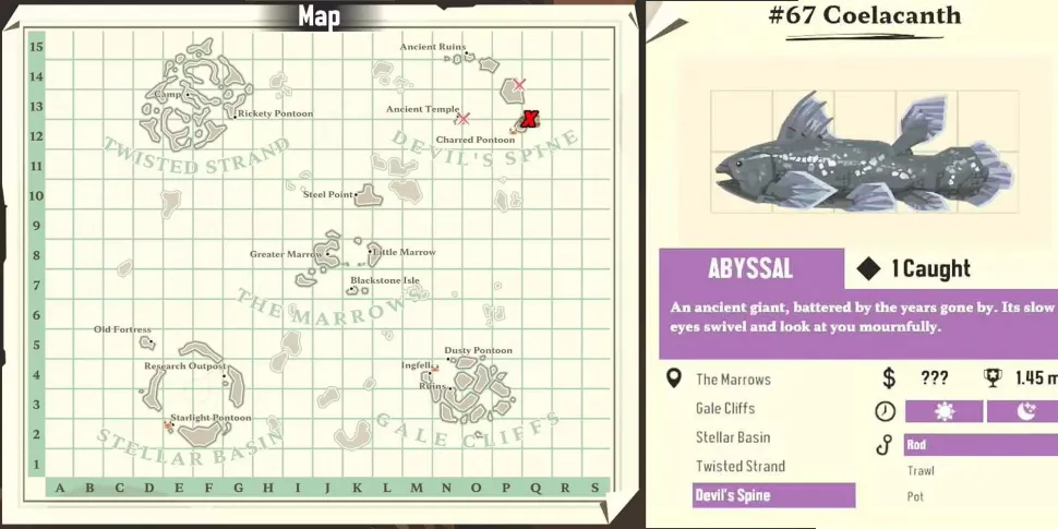 Последней и самой коварной из четырех рыб, которые необходимо поймать, чтобы завершить Recording Rarities Pursuit, является неуловимый Coelacanth. Это гигантское существо из Бездны займет 7 слотов для груза и будет стоить 250 долларов, как и другие редкие виды. Его можно найти на самой восточной стороне Хребта Дьявола.
