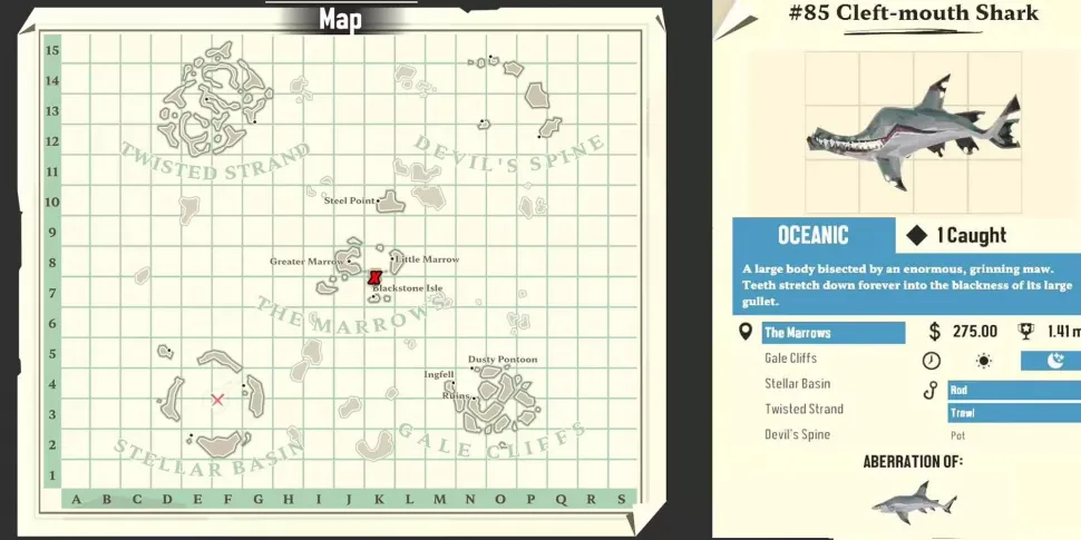 The Cleft-Mouth Shark - это аберрация черноперых рифовых акул. Если повезет, игроки смогут найти эту рыбу относительно рано в игре. Как правило, акулы обитают в Марроузе, у берегов острова Блэкстоун. Однако убедитесь, что в грузовом отсеке достаточно места, так как неудобная форма может быть трудно управляемой в загроможденном инвентаре.