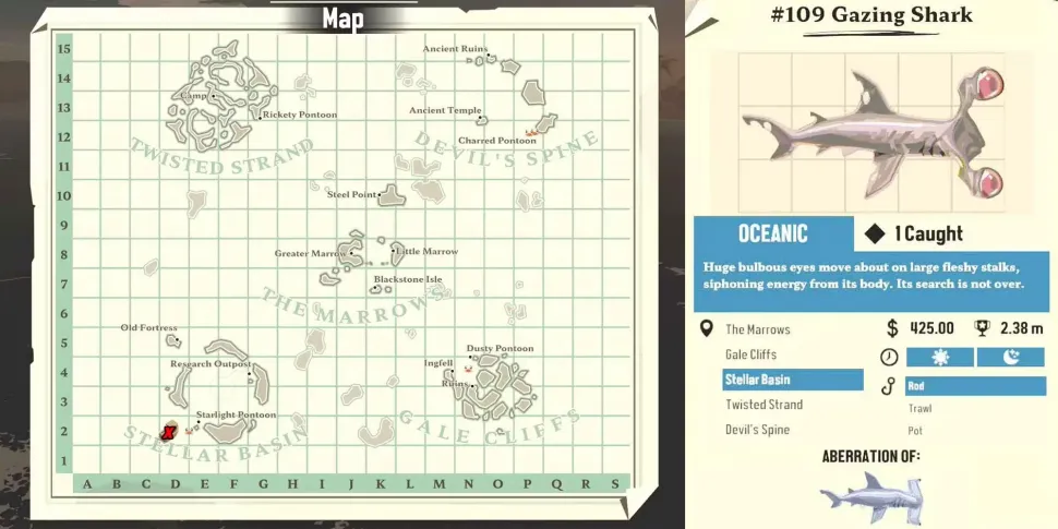 The Gazing Shark - самая ценная рыба в Dredge, и поэтому она является чрезвычайной редкостью. Эту аберрацию акулы-молота можно встретить во внешних водах за пределами Звездного бассейна, и она занимает такое же место в форме языка, как и акула-молот. Моряки, которым удастся поймать одну из этих громадин, смогут рассказать о ней на всех пяти островах архипелага Dredge.