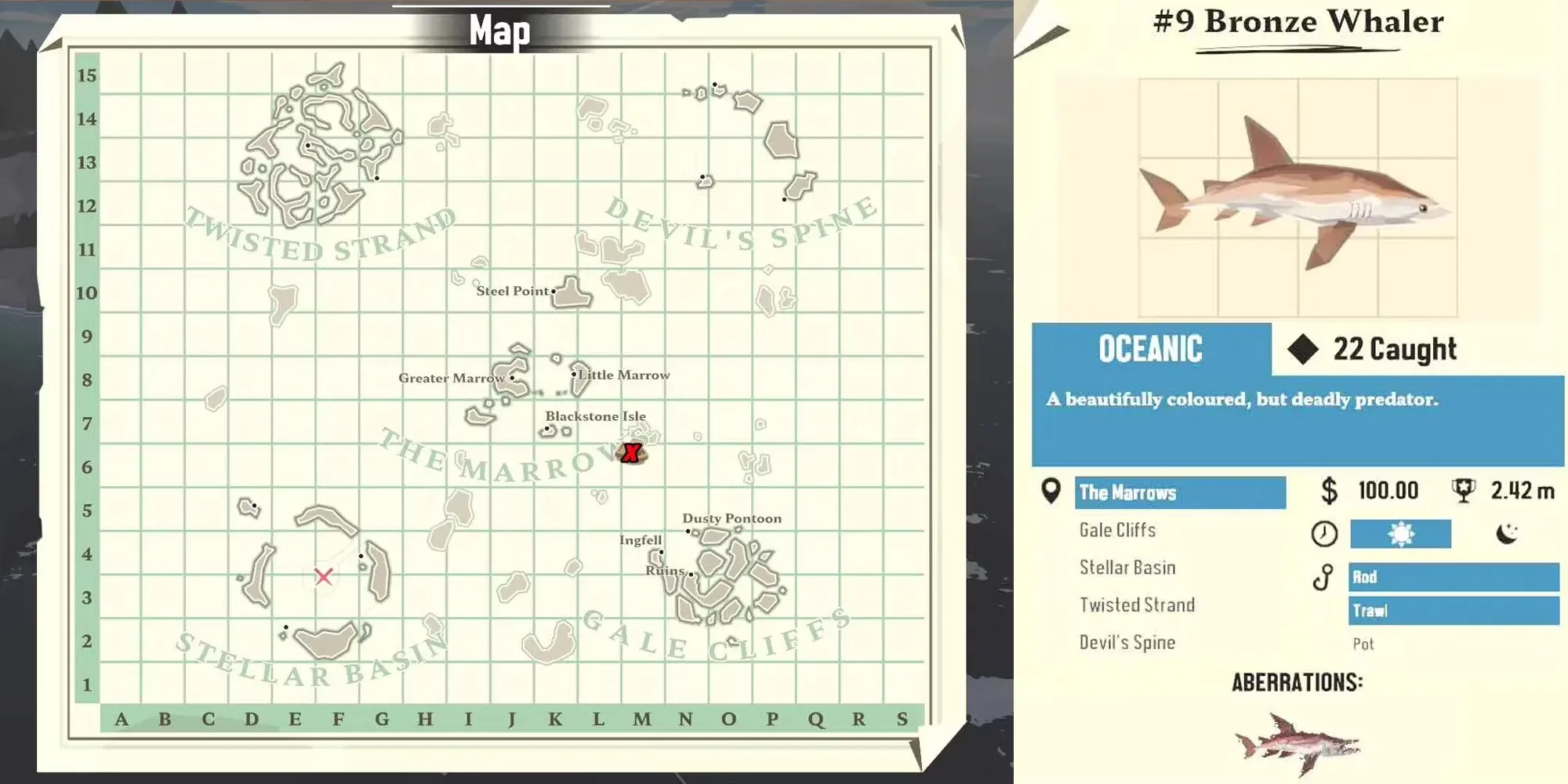 В Dredge есть несколько различных видов рыб, и для каждого из них игроки должны приобрести удочки, соответствующие каждому виду рыбы. Например, для прибрежной рыбы потребуется удочка, подходящая для ловли в прибрежных водах, а для рыбы, обитающей в мангровых зарослях, потребуется необходимая модернизация для ловли в мангровой среде. Ценность каждой рыбы также немного варьируется в зависимости от ее веса, поэтому здесь указана приблизительная стоимость, основанная на средней стоимости, за которую ее можно продать. Трофейные рыбы и аберрации каждого вида, конечно же, будут стоить дороже.