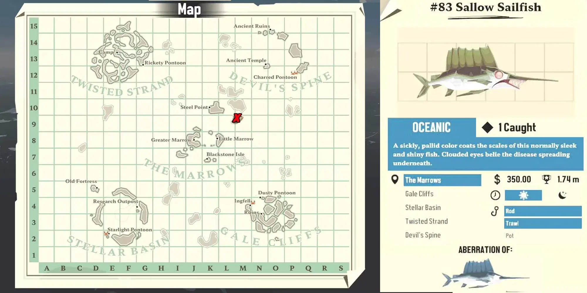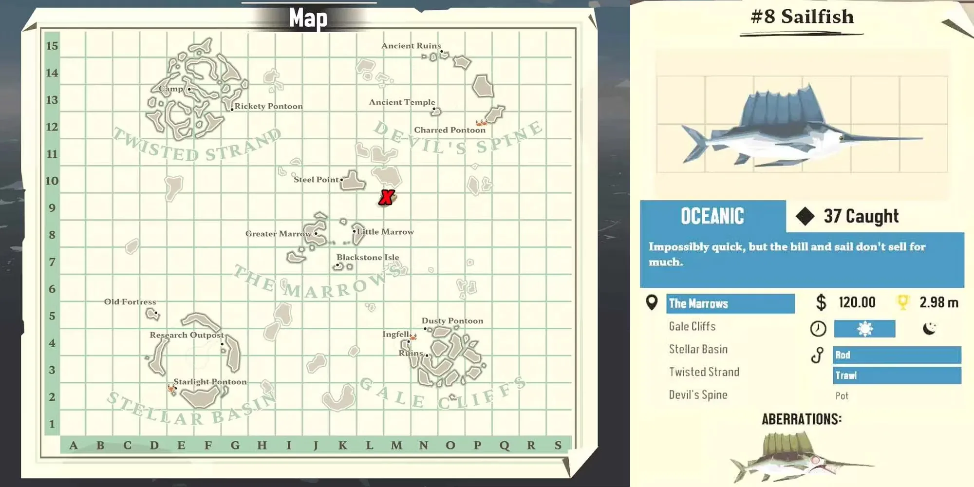 The Sailfish - еще один океанический вид, его обычно можно встретить между Марроузом и Звездным бассейном. Хотя они имеют довольно неудобную форму, они не занимают много места в инвентаре и стоят того благодаря высокой стоимости, за которую их продают.