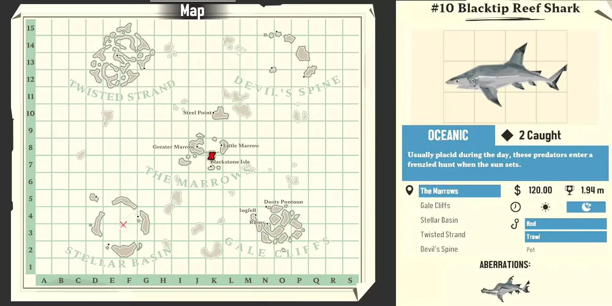 The Cleft-Mouth Shark - это аберрация черноперых рифовых акул. Если повезет, игроки смогут найти эту рыбу относительно рано в игре. Как правило, акулы обитают в Марроузе, у берегов острова Блэкстоун. Однако убедитесь, что в грузовом отсеке достаточно места, так как неудобная форма может быть трудно управляемой в загроможденном инвентаре.