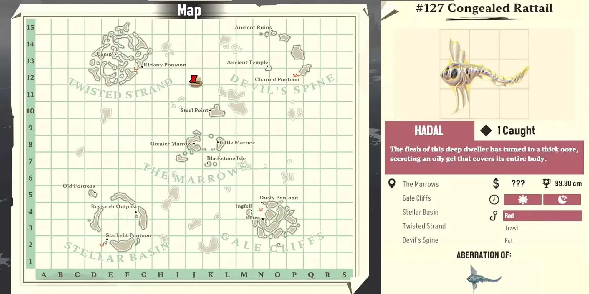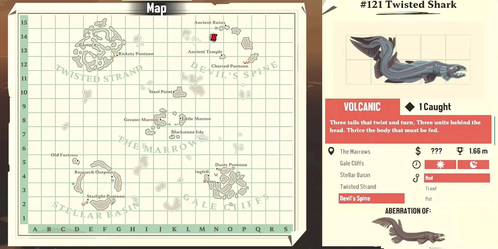 Это отклонение Pale Skate можно найти в Devil's Spine, и для его добычи потребуется вулканическое рыболовное снаряжение. При относительно низкой стоимости емкости в 5 мест это существо стоит того, чтобы его поймать. Однако для его поимки придется пройти через некоторые из самых опасных участков карты, поэтому будьте особенно осторожны, охотясь за этим существом.