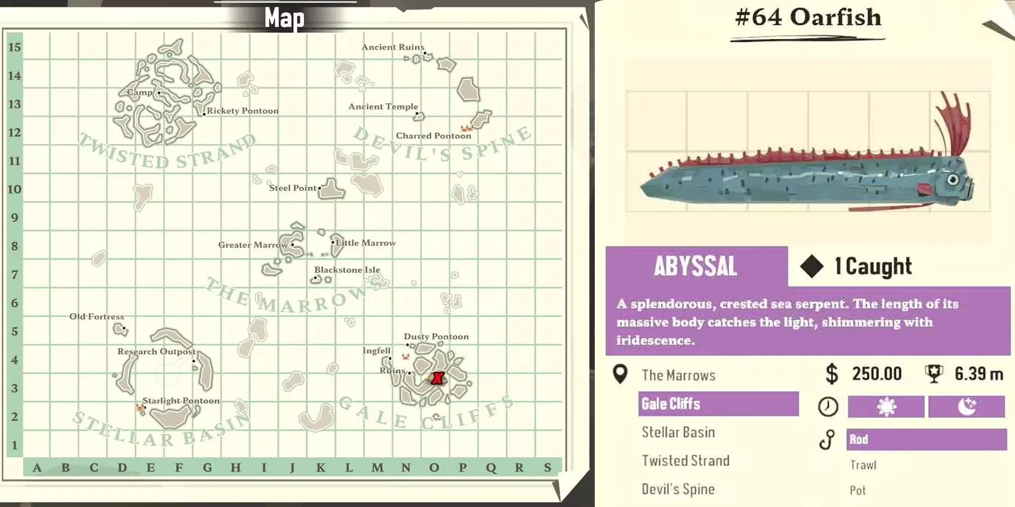 Oarfish - редкий и очень востребованный абиссальный вид, который иногда можно найти во внутренних фьордах Gale Cliffs. Ее стоимость составляет ошеломляющие 250 долларов, и это самый ценный вид, который можно найти в этой области игры. Как и Gulper Eel, Oarfish будет запрошена Странствующим торговцем в рамках задания "Запись редкостей". Однако ее длинная L-образная форма может быть неудобна для размещения в инвентаре, поэтому перед поиском этого существа убедитесь, что в инвентаре достаточно места.