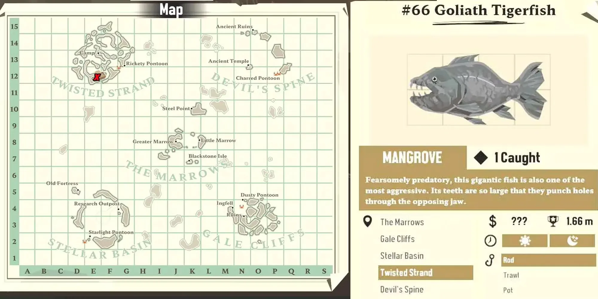 The Goliath Tigerfish - еще одна рыба, которую необходимо поймать, чтобы выполнить задание "Recording Rarities Pursuit". Как и другие рыбы, участвующие в задании, она также будет стоить 250 долларов. Goliath Tigerfish можно найти в Twisted Strand и она займет 8 слотов для груза в инвентаре.