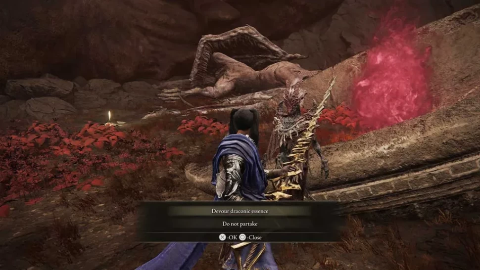 Подъедьте к дракону, и у основания его останков вы найдете гигантский горящий тигель, место Благодати и NPC - жрицу дракона. Поговорите с ней, пока она не даст вам возможность поглотить драконью сущность, на что вы должны согласиться.