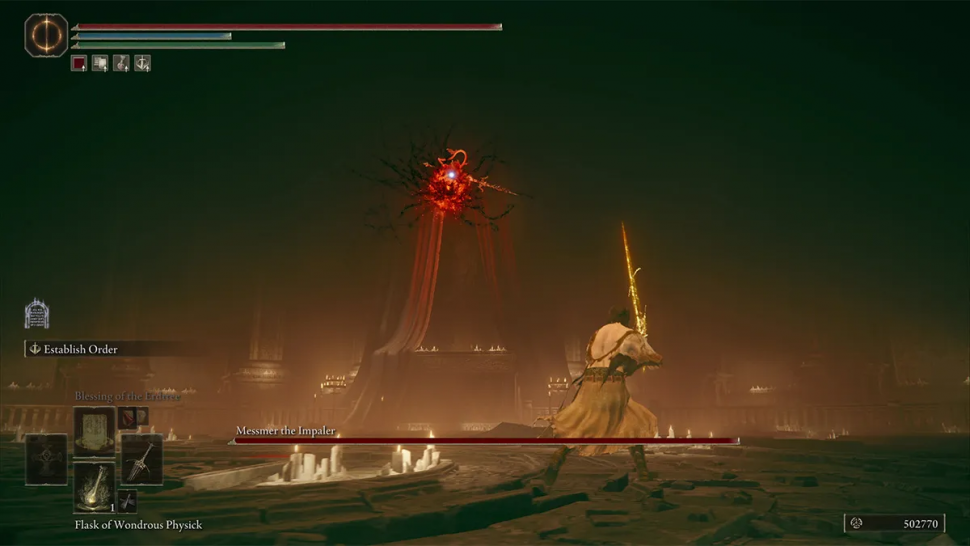 В бой нужно вступать с максимальным количеством здоровья, чтобы иметь максимальный шанс выжить. С медальоном Crimson Amber Medallion+3, полученным от босса "Рыцарь смерти" в катакомбах Fog Rift (сразу после начала расширения), 60 Vigor и Morgott's Great Rune у вас почти 2 600 здоровья, чего вполне достаточно, чтобы пережить одну из комбо Мессмера и восстановиться.