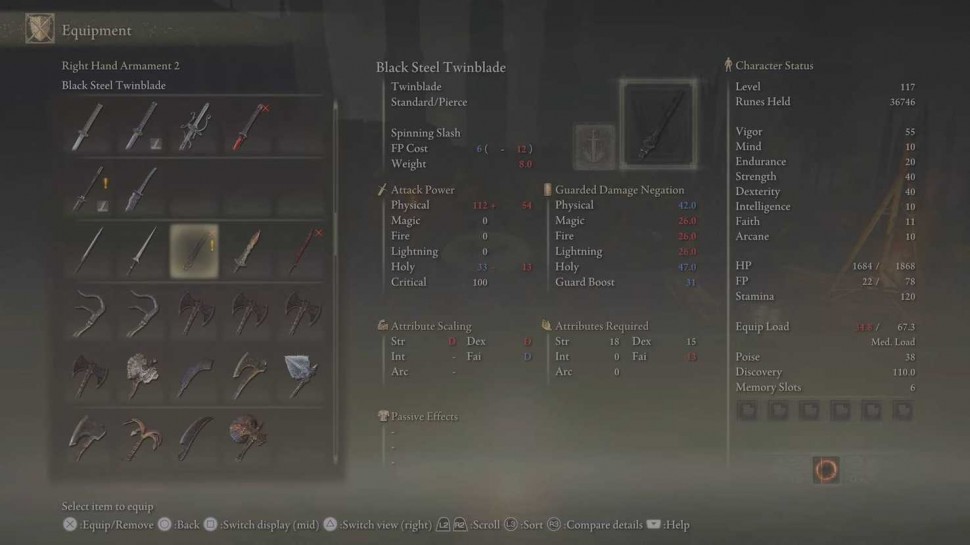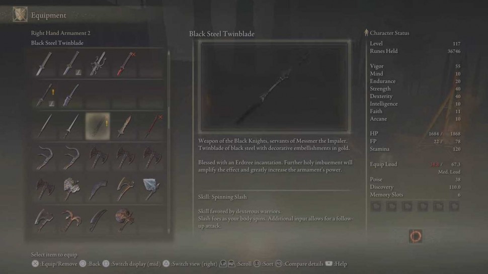 Среди оружия, доступного в Elden Ring: Shadow of the Erdtree, выделяется новый двойной клинок из черной стали, впервые появившийся в этой категории оружия (по крайней мере, в Elden Ring). Двойной клинок из черной стали - это первый двойной клинок, у которого есть требование веры: в описании оружия говорится, что Святое наложение особенно эффективно для этого оружия.